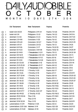 This sort of reading plan is pretty common. Here’s a link to DailyAudioBible’s program. I’ll show you how they schedule October: